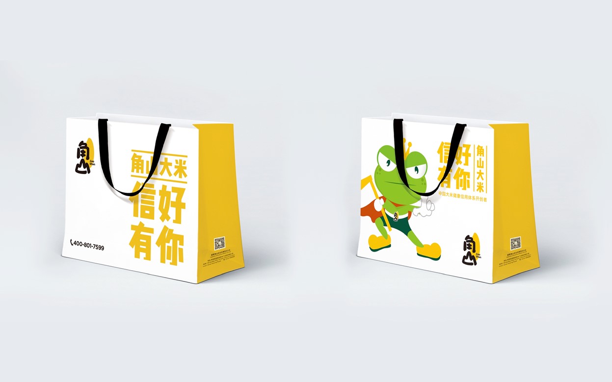 角山大米的視覺方面采用黃色,品牌調(diào)性摒棄傳統(tǒng)大米品牌的風(fēng)格,針對更加的年輕和簡約,符合當(dāng)代新消費的審美,打造全新品牌視覺體系,傳遞可信賴的大米品牌新形象。