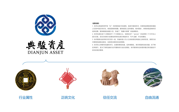 2.整體標(biāo)志用藍(lán)色系,傳遞出“典駿資產(chǎn)”平臺(tái)的安全、嚴(yán)謹(jǐn)和科學(xué)屬性;
