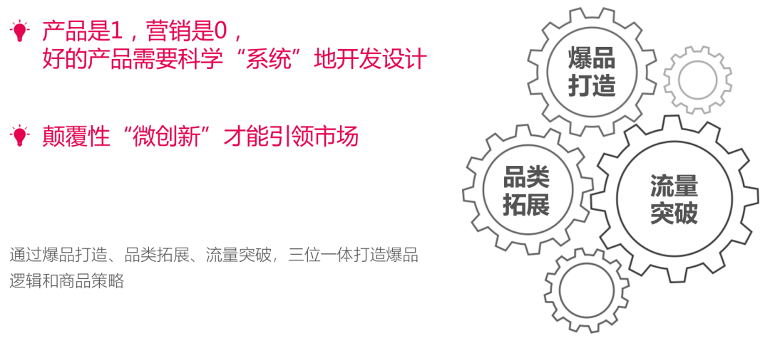 產(chǎn)品塑造的核心,是對(duì)用戶的洞察創(chuàng)造,從單純的占領(lǐng)“產(chǎn)品品類”轉(zhuǎn)向經(jīng)營“年輕人和產(chǎn)品”,最終營銷一種“品牌綜合體驗(yàn)”或“生活方式”??梢酝ㄟ^爆品打造、品類拓展、流量突破,三位一體打造爆品邏輯和商品策略。